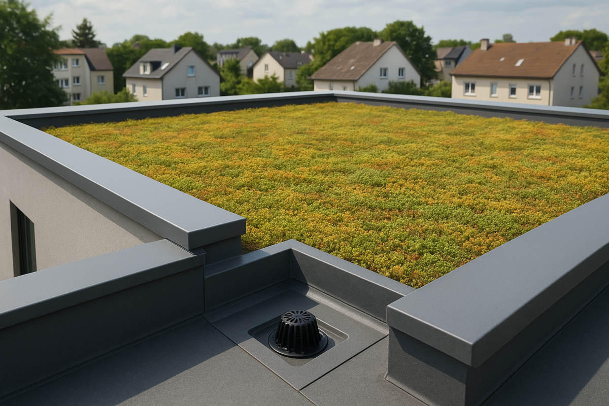 • Schutz kritischer Details: Vegetationsfreie Zonen an Einläufen, Wartungswegen, Lichtkuppeln und technischen Aufbauten reduzieren Verschattung, Durchwurzelungsdruck an Details und das Risiko von Verstopfungen.