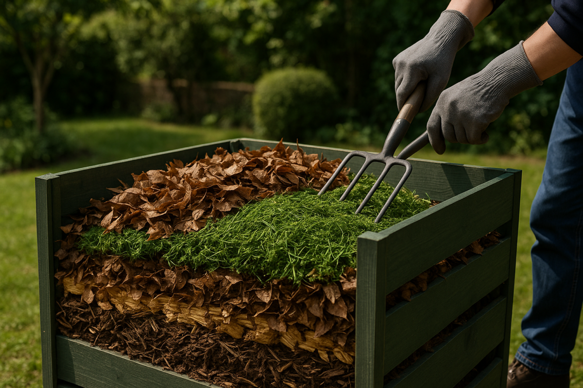 - Grünlagen dünn halten: Rasenschnitt und Küchenabfälle nur 2–5 cm, danach sofort mit trockenem Braunmaterial abdecken.