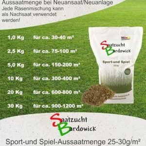 - NEUANSAAT UND NACHSAAT: Neuansaat Aussaatmenge 25 - 30 g/m² -> 10 kg reichen für ca. 300 - 400 m². Nachsaat Aussaatmenge 15 - 20 g/m²