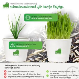 - ⏱ ERGIEBIG UND SCHNELLKEIMEND - Bei der Entwicklung haben wir darauf geachtet, dass diese Rasenmischung schnellkeimend und ergiebig ist. 25 - 30 g/m² -> 10 kg reichen für ca. 300 - 400 m². Jedem Paket liegt eine deutsche bebilderte Anleitung zur optimalen Anlage Ihrer Rasenfläche bei.