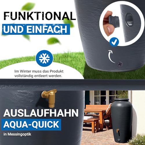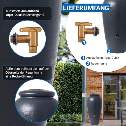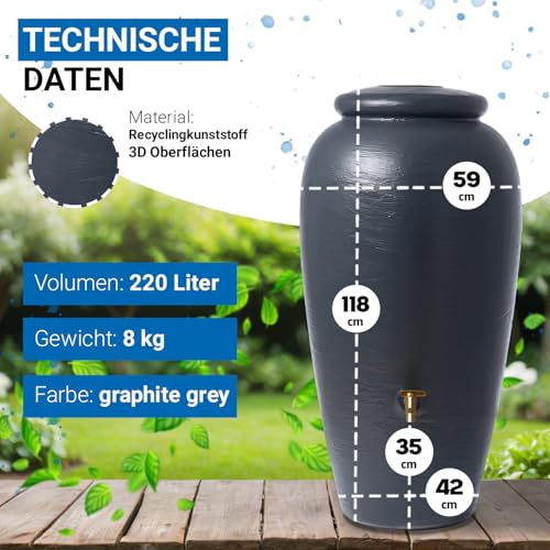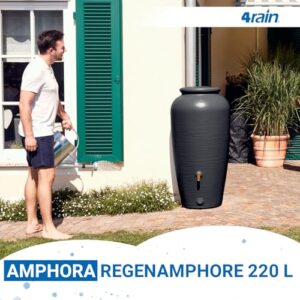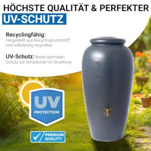 - 🌿 MEDITERRANES AMPHOREN-DESIGN: Die 4rain Amphora Regentonne in klassischem Graphitgrau bringt mediterranes Flair in Ihren Garten, die Terrasse oder den Außenbereich. Die elegante Form erinnert an antike Amphoren und macht die Regentonne zu einem stilvollen Blickfang, der Funktionalität und Ästhetik perfekt verbindet. Ideal für alle, die Wert auf ein harmonisches Gartendesign mit exklusiver Note legen.