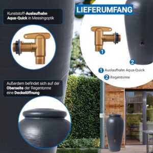 - 🛠️ PRAKTISCHE AUSSTATTUNG: Zwei integrierte 19-mm-Gewindeanschlüsse (3/4") ermöglichen eine einfache Wasserentnahme und eine komfortable Entleerung zum Frostschutz. Im Lieferumfang enthalten sind ein hochwertiger Auslaufhahn sowie eine praktische 18-cm-Deckelöffnung für schnellen Zugriff. Damit bietet die Regentonne maximale Benutzerfreundlichkeit bei jeder Wetterlage.