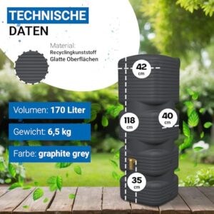 - 🌿 Mit 170 Litern Speichervolumen unterstützt die Regenwassertonne das gezielte Regenwasser sammeln für die Gartenbewässerung und andere Anwendungen rund ums Haus. Der Behälter ist zur Aufstellung an der Hauswand vorgesehen und eignet sich dadurch für kleine Standorte, an denen ein Wasserbehälter für den Garten sonst zu viel Platz beansprucht. Der Fallrohranschluss ist für eine maximal empfohlene Dachfläche von 50 m² ausgelegt. So wird aus der Regentonne für den Garten ein praktischer Wasserspeicher für die kostenlose Nutzung von Regenwasser.