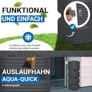 - 📏 Diese Regentonne ist als Wandtank für enge Platzverhältnisse gebaut und nutzt nur eine geringe Grundfläche von 42 x 40 Zentimetern. Die schmale Regentonne passt an die Hauswand und eignet sich dadurch auch für den Balkon. Als eckige Regentonne wirkt der Behälter ruhig und aufgeräumt statt sperrig. Die graphite grey Optik macht aus dem Regenwasser-Wandtank eine moderne Lösung für den Außenbereich. So verbindet der Regenwassertank eine schlanke Form mit einem klaren Auftritt. Gerade bei kleinen Standorten bleibt dadurch mehr nutzbarer Bereich frei.