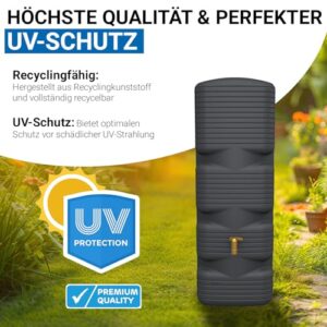 - ♻️ Der Regenwasserbehälter besteht aus Recyclingkunststoff und folgt damit einem nachhaltigen Produktdesign für den Alltag im Garten. Gleichzeitig ist der Behälter zu 100 % recycelbar und verbindet so Nutzung und Wiederverwertung in einem durchdachten Konzept. Witterungsbeständige Materialien mit hohem UV-Schutz unterstützen eine lange Lebensdauer im Freien. Als Regentonne aus Plastik bleibt der Wandtank robust und pflegeleicht. Die Fertigung Made in Germany steht zudem für eine saubere Verarbeitung.