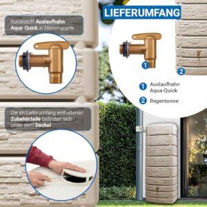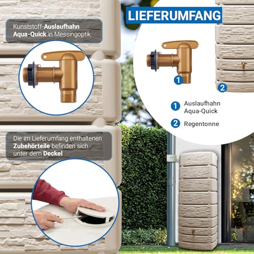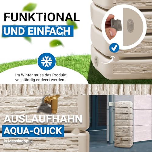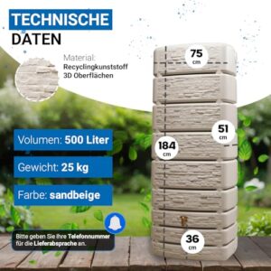 - 🎨 Dieser Wandtank zeigt eine trendige Steindekor Front und einen zeitlosen sandfarbenen Beigeton. Dadurch wirkt die Regentonne an der Hauswand stilvoll und formschön. Die klare Front verleiht dem Regenwasserbehälter eine ruhige Präsenz im Garten. Als schöne Regentonne fügt sich der Wassertank dezent in viele Umgebungen ein. Gerade wer eine Regentonne modern, eine Regentonne in Steinoptik oder einen Wandtank für Regenwasser sucht, erhält hier eine Lösung mit zurückhaltender Optik. So verbindet die Regenwassertonne Gestaltung und Funktion auf überzeugende Weise.