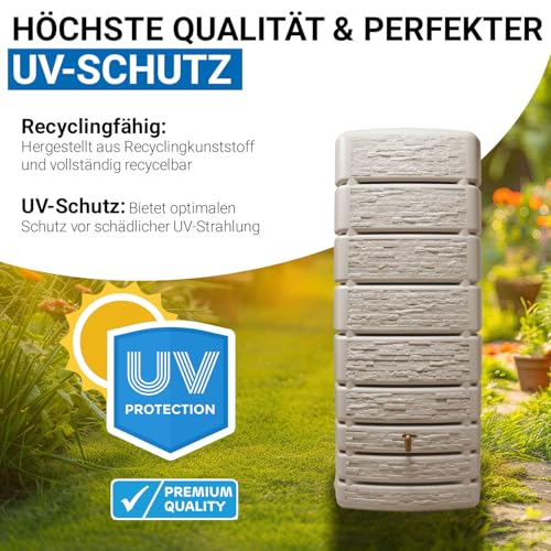 - ♻️ Dieser Regenwasserbehälter wird aus Recyclingkunststoff hergestellt und ergänzt die Funktion als Regentonne, Regenwassertonne und Wassertank um einen klaren Materialvorteil. Der Behälter ist zu 100 Prozent recycelbar und steht damit für ein nachhaltiges Produktdesign im Garten. Witterungsbeständige Materialien machen den Regenwassertank oberirdisch für den dauerhaften Einsatz im Freien geeignet. Ein hoher UV Schutz unterstützt die lange Nutzung dieser Regentonne aus Kunststoff. Qualität Made in Germany rundet den Eindruck eines robusten Wasserbehälters Garten und Wassertanks für den Außenbereich ab.