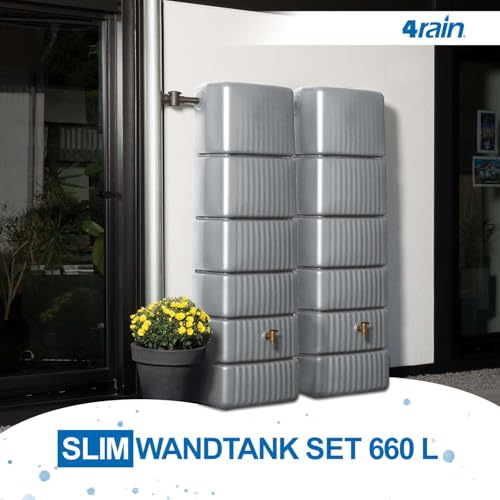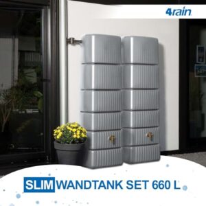 - ✅ Platzsparendes & modulares Design – Das 4rain SLIM Wandtank SET 660 L besteht aus zwei schlanken Regentonnen mit je 330 Litern, die an der Hauswand aufgestellt werden können. Dank der kompakten Form und des mitgelieferten Verbinders lässt sich das Set flexibel erweitern und an verschiedene Bedürfnisse anpassen.