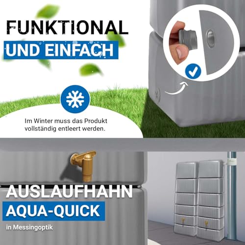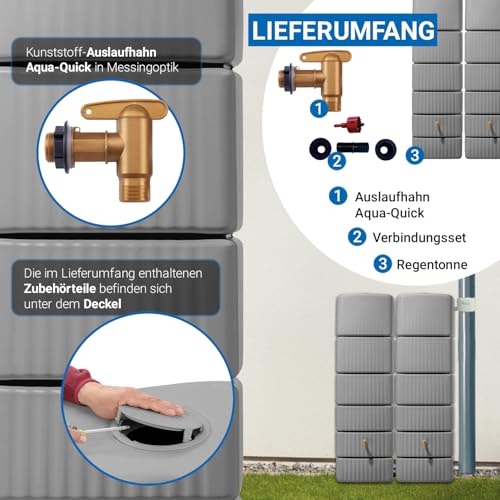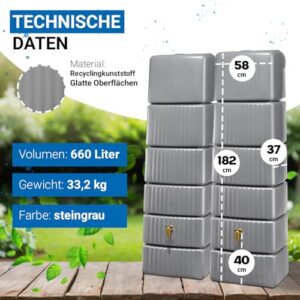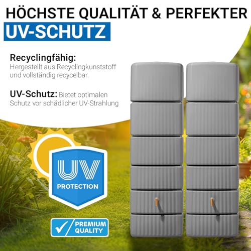 - ♻️ Nachhaltig & 100 % recycelbar – Dieser Regenwasserbehälter wird aus recyceltem Kunststoff gefertigt und ist vollständig wiederverwertbar. Bei der Entwicklung wurde auf ein umweltfreundliches Design geachtet. Qualität Made in Germany sorgt für höchste Standards und Langlebigkeit.