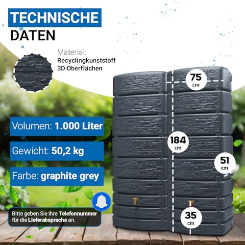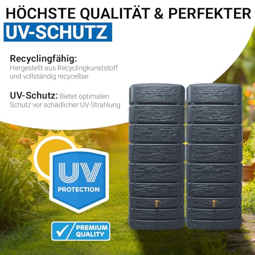 - 🌿 1000 LITER REGENWASSER SPEICHERN: Mit unserem 4rain Slim Stone Decor Wandtank-Set sammeln Sie kostenlos Regenwasser ohne Aufwand! Zwei formschöne Regentonnen mit je 500 Litern bieten zusammen 1.000 Liter Fassungsvermögen – ein idealer Wasserspeicher für mittlere bis große Gärten. Nutzen Sie unser 4Rain Regenfass als effizienten Regenwasserbehälter, sparen Sie Geld und schonen Sie Ressourcen.