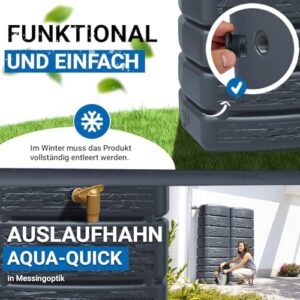 - 💎 MODERN & PLATZSPAREND: Die hochwertige Steinoptik in Graphitgrau macht aus dem oberirdischen Regenspeicher ein echtes Highlight. Mit ihrer schmalen Bauform passt die Regentonne perfekt an Hauswände oder Ecken. Das durchdachte Design sorgt dabei für maximale Stabilität ohne Ausbeulen – auch bei vollständig gefülltem Wassertank.