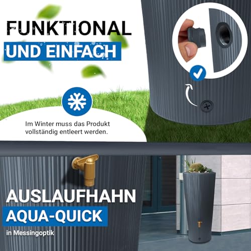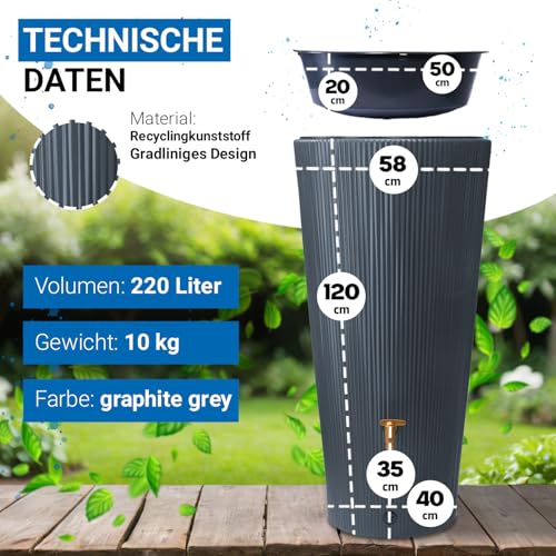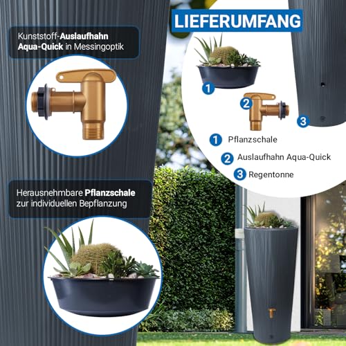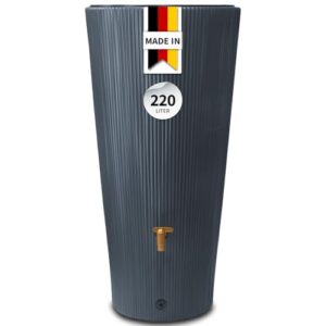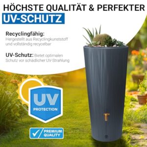 - 🎨 Das gradlinige Design macht diese moderne Regentonne zu einem starken Akzent im Garten. Die außergewöhnliche Oberflächenstruktur verleiht dem Regenfass eine markante Haptik, während Graphite Grey und Anthrazit eine ruhige, moderne Wirkung schaffen. Die herausnehmbare Pflanzschale mit 20 Zentimetern Tiefe eröffnet Raum für individuelle Dekoration. Dadurch wirkt die bepflanzbare Regentonne wie ein Möbelstück für den Außenbereich und nicht wie ein reiner Wasserbehälter für den Garten. Als schöne Regentonne verbindet sie Regenwassernutzung mit Dekoration auf besonders elegante Weise.