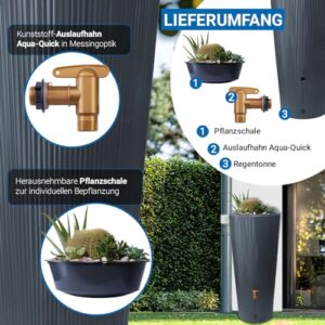- 🔧 Die Nutzung als Wassertonne beginnt mit einer einfachen Vorbereitung für die Wasserentnahme im unteren Bereich. An den vorhandenen Gewinden lässt sich der mitgelieferte Auslaufhahn montieren, und auch ein Schlauchset ist als optionales Zubehör vorgesehen. Damit eignet sich die Regentonne mit Pflanzschale nicht nur als dekorativer Blickfang, sondern auch als praktikabler Regenauffangbehälter für eine gezielte Entnahme. Vor der Frostperiode lässt sich eine Restentleerung über den Anschluss umsetzen. So bleibt der Regenwassertank für den Garten funktional auf den saisonalen Einsatz abgestimmt.
