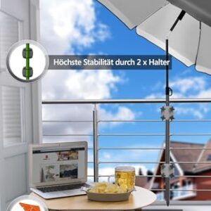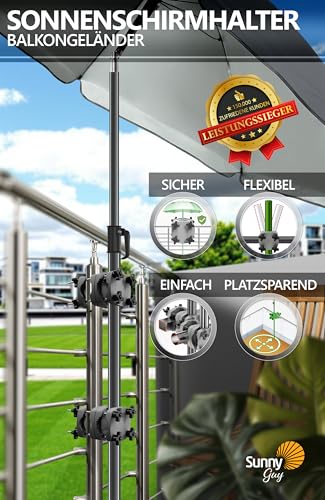 - SCHNELL UND UNIVERSELL MONTIEREN - SunnyGuy lässt sich im Nu an allen runden oder eckigen Balkongeländern, Handläufen, Pfosten vertikal und horizontal anbringen; der Balkon Sonnenschirm ist ruckzuck einsatzbereit