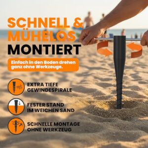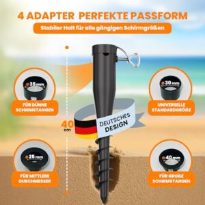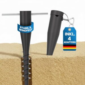 - Diese Bodenhülse Sonnenschirm ist als Einschraubbodenhülse konzipiert, die mühelos in Sand oder lockeren Boden gedreht wird. Der Erdspieß für Strandschirm bietet windfesten Halt und ist ideal als Schirmständer für den Strand.