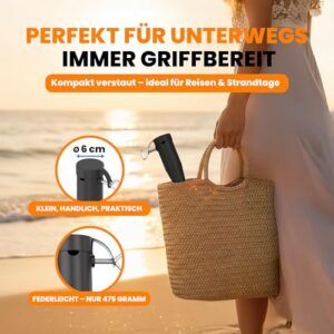 - Mit nur 475 g Gewicht ist der Sonnenschirmständer aus robustem ABS-Kunststoff super portabel. Der Schirmhalter passt in jede Strandtasche und ermöglicht flexibles Eindrehen überall am Strand – ideal für Urlaube, ohne Belastung.