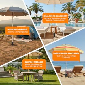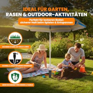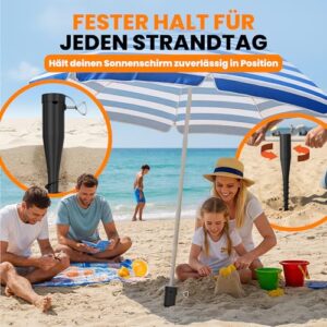 - Im Gegensatz zu Metall ist diese Bodenanker für Sonnenschirm UV- und korrosionsbeständig. Der Sandanker widersteht Meerwasser und Sand, bleibt kühl und ist haltbarer – perfekte Halterung für langfristigen Strandgebrauch.