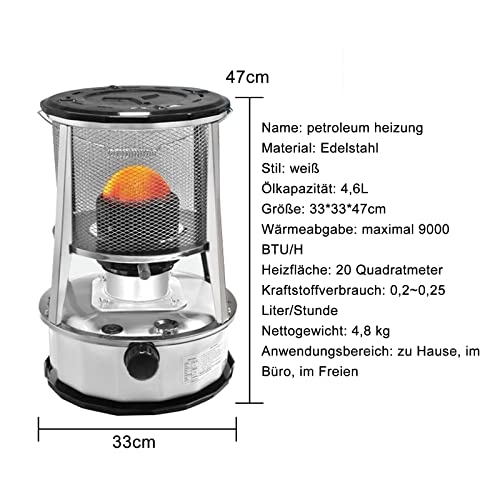 - 【Effizientere Petroleum Heizung】 Petroleumkocher Verbrennungseffizienz von bis zu 99,8 %, Halbkugelförmige Verbrennung, vergrößerte Kontaktfläche, 360° Umgebungsheizung. Der maximale Heizwert beträgt 9000 BTU/H (entspricht 3000 W) und der Kraftstoffverbrauch pro Stunde beträgt 0.2L~0.25L. Nachhaltiges Brennen für 21~24 Stunden.Kann den Raum von etwa 20 Quadratmetern schnell ansteigen lassen.