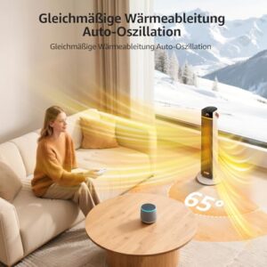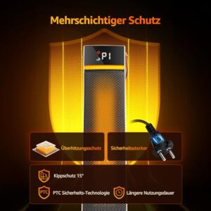- 【Vollständiger Sicherheitsschutz】Ausgestattet mit Doppelschutz (Kipp- und Überhitzungsschutz) schaltet das Gerät automatisch bei Instabilität oder Überhitzung ab. Leiser Betrieb macht den Heizlüfter energiesparend ideal für Wohnbereiche.