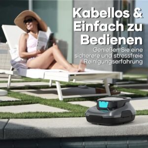 - KABELLOS & EINFACH ZU BENUTZEN: Die Aktivierung mit einem Klick ermöglicht Ihnen völlig freie Hände. Im Gegensatz zu anderen pool robotersauger ist der poolreiniger komplett kabellos, was bedeutet, dass keine Kabel gewickelt oder verheddert sind. Er ist auch leichter und einfacher zu lagern als kabelgebundene Reiniger.