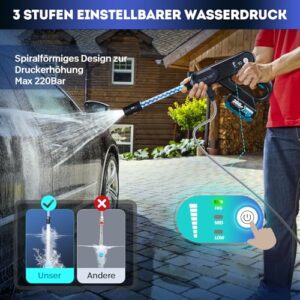 - LEISTUNGSSTARKER AKKU HOCHDRUCKREINIGER: Dank Kabelloser Hochdruckreiniger Akku mit innovativem Upgrad überzeugt durch sein spiralförmiges Druckkanaldesign, verbesserte bürstenlose Motor und 3-Stufiger Druckmodus das eine kraftvolle Reinigungsleistung bis 220 Bar ermöglicht ,ideal zur mühelosen Beseitigung von hartnäckigem Schmutz. Dieser Akku-Hochdruckreiniger ermöglicht Ihnen eine schnelle und effiziente präzise Reinigung in kurzer Zeit.