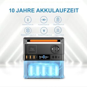 - 【300W 288Wh MOBILE STROMVERSORGUNG FÜR UNTERWEGS 】 Kleine Größe, mit einem Tragegriff Design macht die Mobile Powerstation für Camping wirklich tragbar. Mit geringem Geräusch können Sie ruhig einschlafen, auch wenn Sie es die ganze Nacht verwenden. Der ideale Begleiter für unterwegs, beim Campen, im Garten oder als Notstromversorgung zuhause.Die eingebaute Lampe kann als Notbeleuchtung verwendet werden.Abmessungen: 20.6 x 16.5 x 11cm ; Gewicht: nur 3.4kg.
