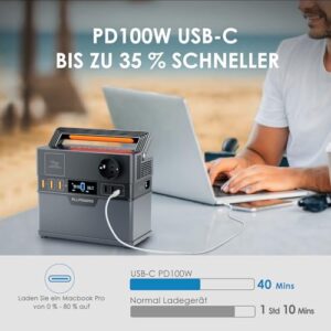 - 【5 Eingang Lademethoden】Die tragbare Powerstation hat 5 Möglichkeiten, die Notbatterieversorgung aufzuladen. Standard-Wechselstrom mit Solarladung (max. 300W), ca. 1 Stunde, Standard-Wechselstrom mit Ladung über den Zigarettenanzünder im Auto (max. 300W), ca. 1 Stunde, Standard-Wechselstromladung (max. 200W), ca. 1,5 Stunden, Ladung über den Zigarettenanzünder im Auto (max. 100W), ca. 3–4 Stunden, Solarladung (MPPT max. 100W), ca. 3–4 Stunden.