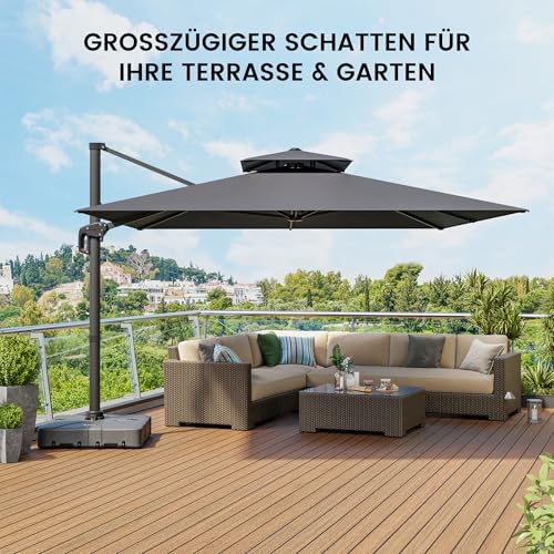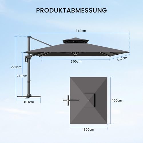 - 【XXL SCHATTENBEREICH】Der rechteckige Ampelschirm 300×400 cm bietet einen besonders großen Schattenbereich – ideal für Garten, Terrasse, Balkon und Pool. Perfekt als Sonnenschutz für Lounge-Möbel, Esstisch-Sets oder großzügige Outdoor-Bereiche.