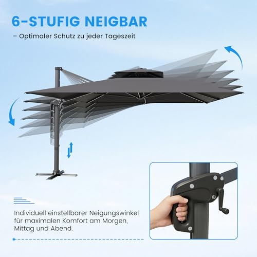 - 【360° DREHBAR & 6-STUFIG NEIGBAR】Dank 360° Rotation per Fußpedal und 6-stufig verstellbarem Neigungswinkel lässt sich der Sonnenschirm flexibel dem Sonnenstand anpassen – optimaler Schatten zu jeder Tageszeit. Benutzerfreundlicher Kurbelmechanismus für müheloses Öffnen und Schließen.