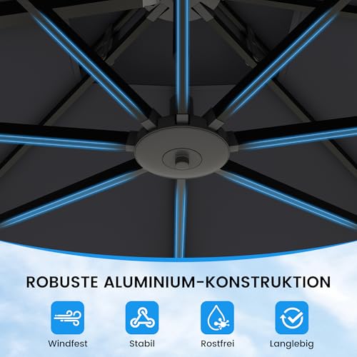 - 【DOPPELTES DACH & WINDSTABIL】Innovatives Doppeldach-Design ermöglicht eine bessere Luftzirkulation, reduziert Hitzestau und verbessert die Windstabilität. Extra dicker Aluminium-Mast und 8 verstärkte Streben sorgen für Robustheit und sichere Nutzung bei wechselnden Wetterbedingungen. Inklusive Kreuzfuß (ohne Gewichte).