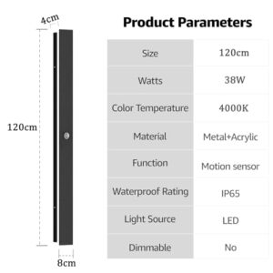 - Einfache Installation: Festverdrahtung der Wand. Spannung: AC220-240V. mit Kurzschlussschutzdesign, Überlastschutzdesign, um vollständige Sicherheit zu gewährleisten. wandleuchte außen bewegungsmelder lange 120cm, Breite 8 cm, 4 cm von der Wand entfernt. LED 38W (3000LM)