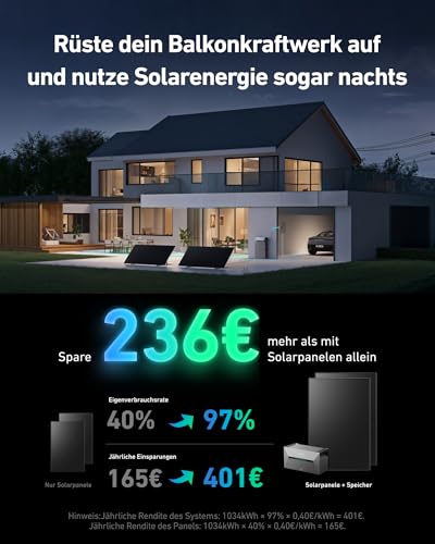 - Spare 236€ mehr pro Jahr: Mit der Solarbank 2 Plus steigt deine Eigenverbrauchsrate von 40% auf 97%. So sparst du 236€ pro Jahr mehr, wie wenn du ausschließlich Solarpanele verwendest.