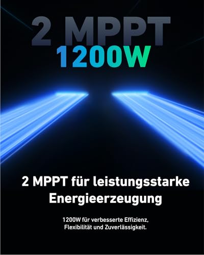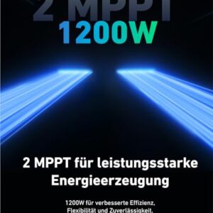 - 2 MPPT und 9,6kWh maximale Kapazität: Lege dir mit diesem 2 MPPT-System (für bis zu 2 Solarpanels) einen Vorrat an Solarenergie mit einer maximalen Leistung von 1200W (600W pro MPPT) an. Füge 5 weitere Akkus für eine maximale Speicherkapazität von 9,6kWh hinzu.