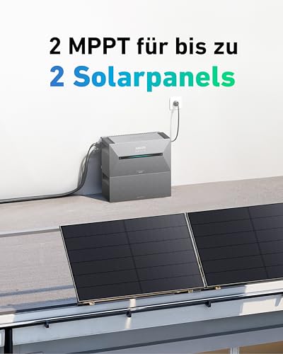 - 2 MPPT und 9,6kWh maximale Kapazität: Lege dir mit diesem 2 MPPT-System (für bis zu 2 Solarpanels) einen Vorrat an Solarenergie mit einer maximalen Leistung von 1200W (600W pro MPPT) an. Füge 5 weitere Akkus für eine maximale Speicherkapazität von 9,6kWh hinzu.