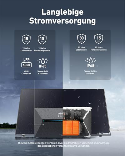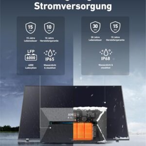 - 15 Jahre Produktlebensdauer: Versorge dein Zuhause 15 Jahre lang mit Strom und profitiere von 10 Jahren Garantieschutz. Die Solarbank 2 Plus hat eine Lebensdauer von 6.000 Zyklen, ist wasser- und staubdicht (IP65) und kann bei bis zu -20 °C betrieben werden.