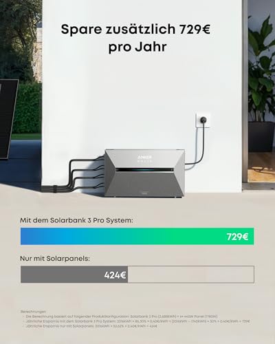 - Lieferumfang: Solarbank 3 E2700 Pro, 1× 3 m AC-Kabel mit Schuko, 4× 445W Solarpanel, Montagematerial, Sicherheitshinweise, ohne Verlängerungskabel für Solarpanels.