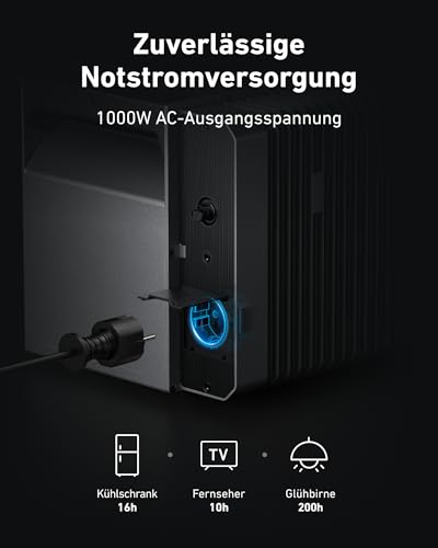 - 1000W NOTSTROMVERSORGUNG: Halte wichtige Geräte mit der 1000W AC-Steckdose auch während eines Stromausfalls am Laufen.