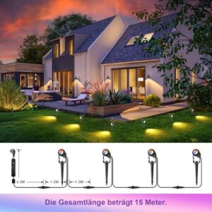 - 【RGB Gartenstrahler mit 15m Kabel】Der Abstand vom Stecker bis zur letzten Lampe beträgt 15M. Der Abstand vom Stecker zur ersten Lampe beträgt 6M, und der Abstand zwischen Lampe und Lampe beträgt 3M. (Hinweise: Wenn Sie denken, dass die Kabel zu kurz ist, können Sie ein Verlängerungskabel kaufen. Hier ist ASIN, 2er-Pack:B07SV2WM6J, 4er-Pack:B081GSVK9R)