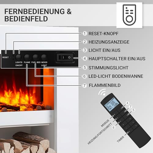 - ECHTES KAMINERLEBNIS: Der Elektrokamin erzeugt ein gemütlich wohliges Kamingefühl durch sein realistisches Kaminfeuer mit 3D-Flammeneffekt und naturgetreuer Darstellung von Holz und Glut. Die perfekte Entspannung nach anstrengenden Tagen.