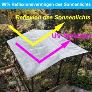- Vielseitig : Aluminium-Schattentuch kann in einer Vielzahl von Anwendungen verwendet werden, einschließlich Zelten, geparkten Fahrzeugen, Hundezwingern, Campingplätzen, Gemüsebeeten und Terrassen. Genießen Sie jederzeit und überall einen kühlen Schatten.