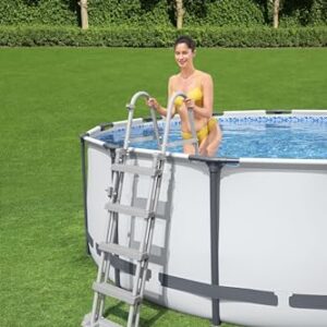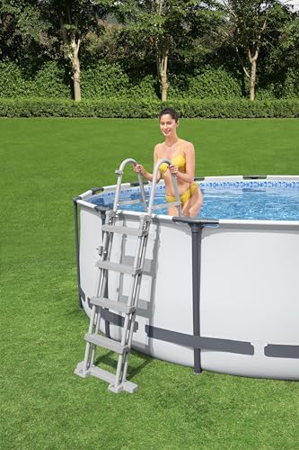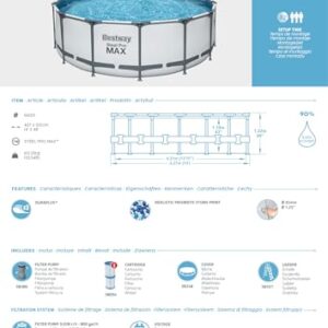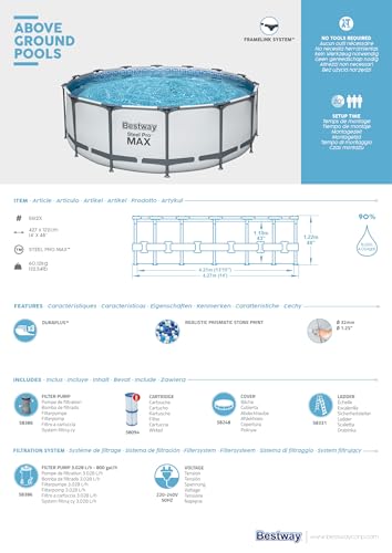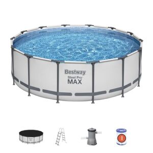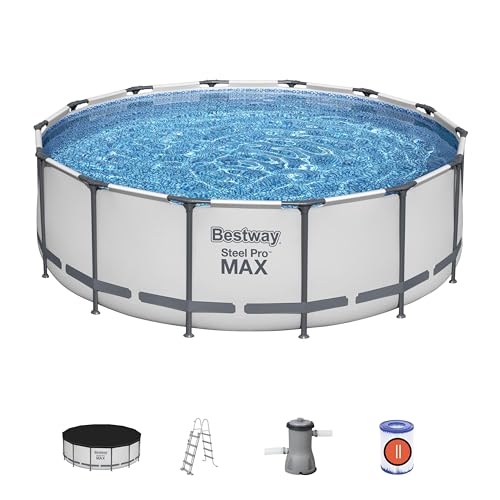 - Lieferumfang: Bestway Steel Pro, 427 x 122 cm, Kartuschenreiniger 3.028 l/h, 1 Leiter, 1 Abdeckung und 1 selbstklebendes Reparaturflicken