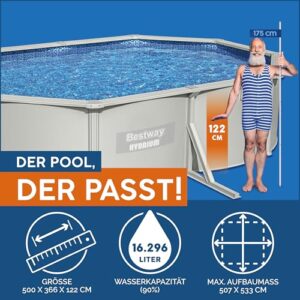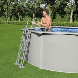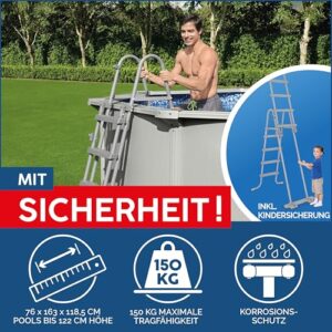 - Inklusive Sandfilteranlage (3.028 l/h, 220-240 V, 85 W, GS-zertifiziert (DEKRA), Schutzklasse I, auch geeignet für den Betrieb in DE / BE / LU), Flowclear Sicherheitsleiter (122 cm), Flowclear PVC-Abdeckplane, Flowclear Bodenplane, ChemConnect Chemikaliendosierer, selbstklebender Reparaturflicken