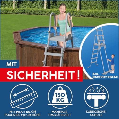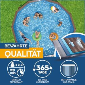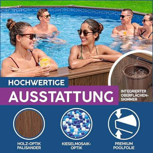 - Verstärkte geriffelte Stahlwände, UV-Schutzbeschichtete Premium-Einlage aus PVC, extra breiter Handlauf, integrierter Oberflächenskimmer