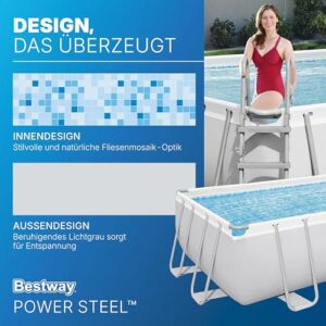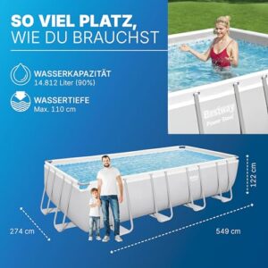 - Größe: 549 x 274 x 122 cm, max. Aufbaumaß: 594 x 314 cm Wasserkapazität (90%): 14.812 Liter, Innenverkleidung in Kieselmosaik-Optik, einfacher Aufbau ohne Werkzeug