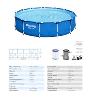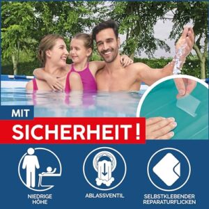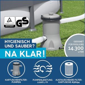 - Inklusive Filterpumpe (2.006 l/h) und passender Filterkartusche, einfaches Entleeren durch integriertes Ablassventil (Gartenschlauchadapter enthalten)