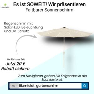 - DESIGN: Genieße mit dem Blumfeldt Flex-Shade Sonnenschirm dank smartem Design und flexibler Ausrichtung entspannte Stunden im Garten, auf der Terrasse oder dem Balkon.