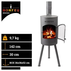 - KOMPAKT & STABIL: Mit einer Höhe von 142 cm und drei stabilen Standfüßen passt der BonGiano SP perfekt in kleinere Gärten oder auf Terrassen. Das markante BonFeu-Logo ist dekorativ ausgestanzt und leuchtet bei Feuer stimmungsvoll auf.