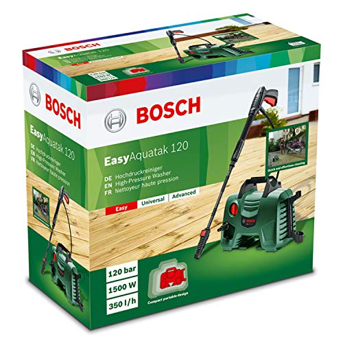 - Lieferumfang: EasyAquatak 120, Hochdruckpistole, 5 m Schlauch, Roto-Punkt-Düse, Hochdruck-Schaumdüse, Flachstrahl-Düse, transparenter Wasserfilter, Karton (3165140935630)