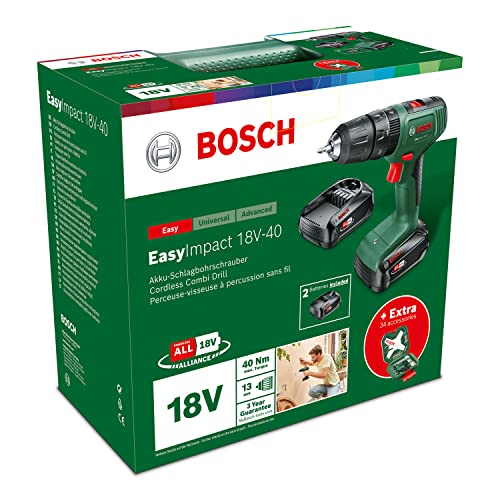 Bosch Home and Garden Akku Schlagbohrschrauber EasyImpact 18V-40 (2x Akku 2,0 Ah, 18 Volt System, mit 34-tlg. Schraubendreher- und Bohrer-Set für Holz, Stein und Metall, im Karton)