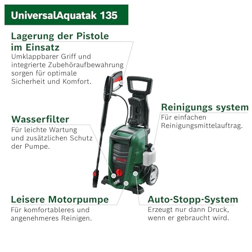 - Lieferumfang: UniversalAquatak 135, Bosch Hochdruckpistole, 7 m Schlauch, 3-in-1-Düse, Hochdruck-Schaumdüse mit Behälter, transparenter Wasserfilter